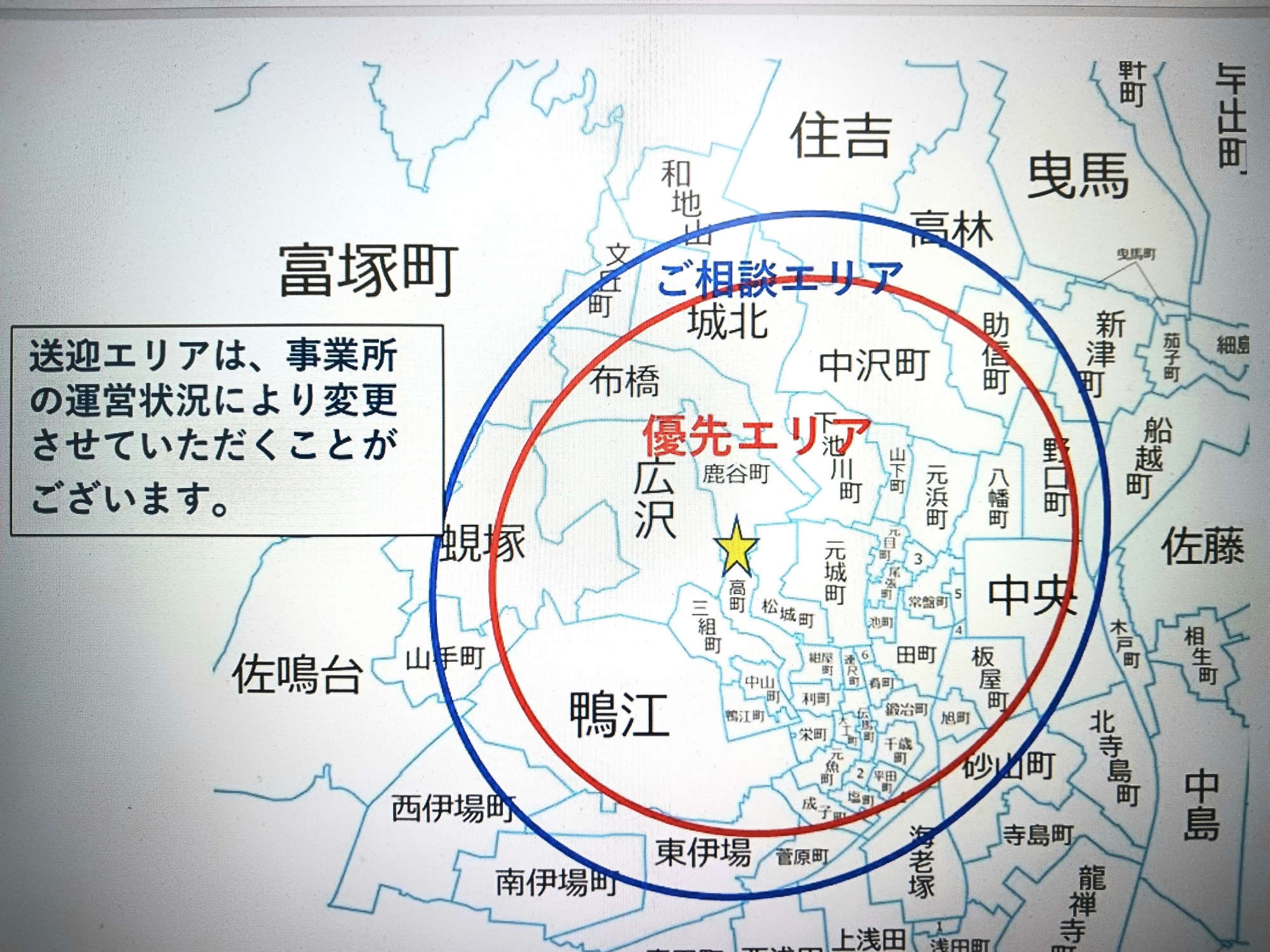 空き状況 R8年4月空き状況 定員:(午前コース12名程度、午後コース12名程度) ○:空きあり △:空きわずか ×:空き無し※ 要介護の方、地図上の送迎エリア内の方を募集中です。※ 午前枠に空きがあります。( 特に火曜日、木曜日、土曜日枠 ) 月曜日 火曜日 水曜日 木曜日 金曜日 土曜日 日曜日 状況 午前△午後 △ 午前○午後× 午前×午後× 午前○午後△ 午前×午後× 午前○